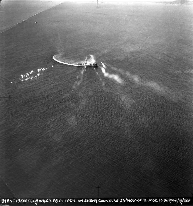 404 skvadronen angriper S/S "Lynx" og S/S "Tyrifjord" utenfor Askvoll, 19.september 1944. På bildet ser vi at "Lynx" forgjeves går i sirkel for å unnslippe angrepene.
