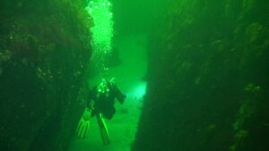 Hopp utti ved pålen, gå ned på grunna (ca 5meter), svøm nordover(mot land) ca 20-30 meter under vann til du kommer til veggen som stuper skrått nedover fra ca 10 meter og ned til ca 35-40 meter, som regel veldig god sikt her. Svøm så østover langs veggen til den runder av sørover. Følg veggen rundt hjørnet (sørover) og svøm tilbake vestover mot båten og opp kløften som går langt tilbake, kanskje 50-100 meter.