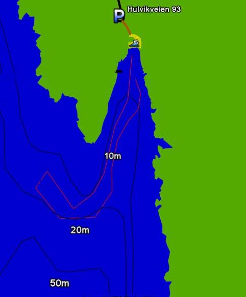 Rød linje viser en bra dykkerute