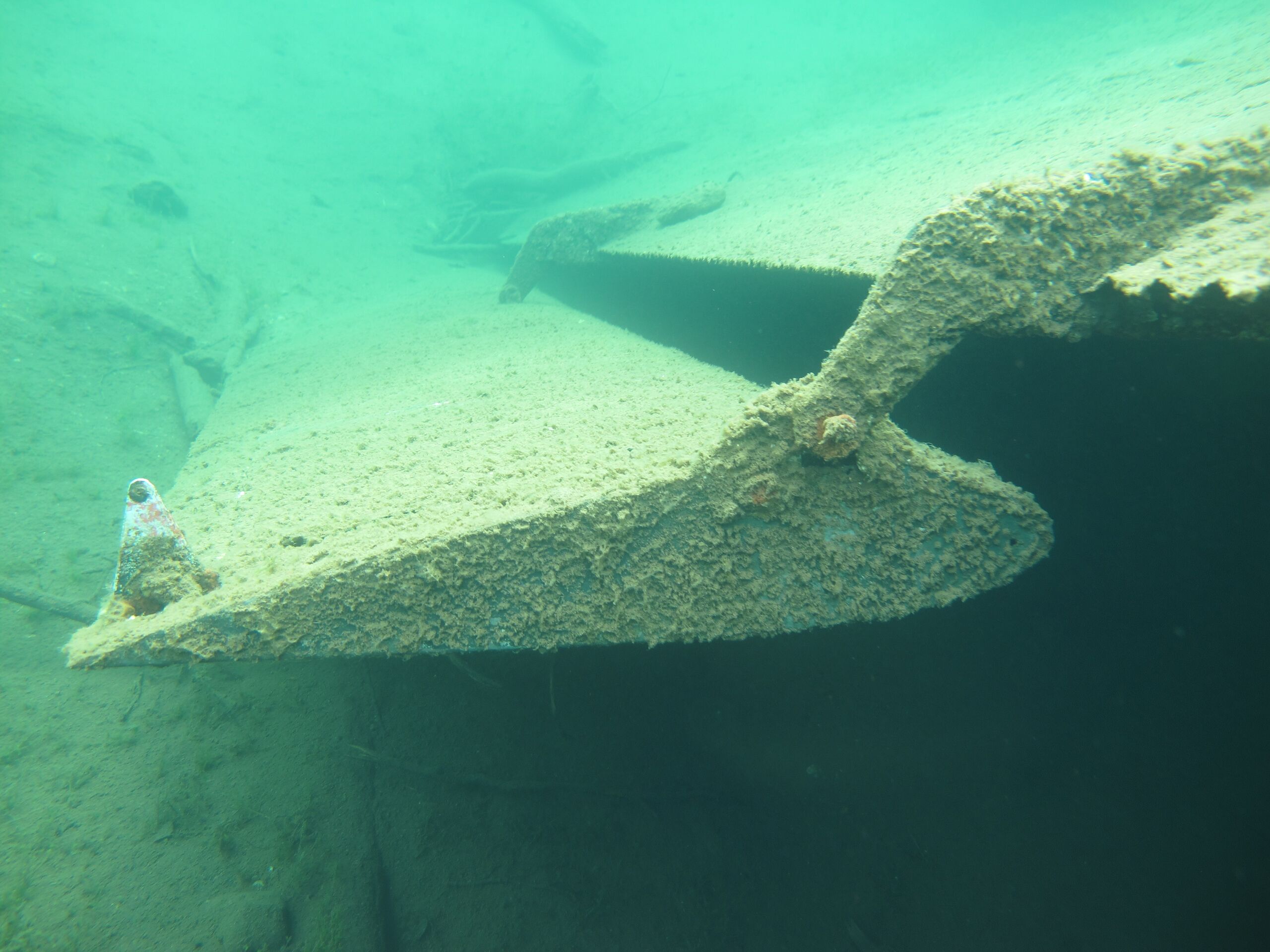 Detalj fra vingen på Junker 52 i Hartvikvatnet. Rorflatens avstand fra resten av vingen var karakteristisk for flytypen. Dette er fra høyre vinge, mot flykroppen. Man ser at innerste del av vingen er begravet i sanden.