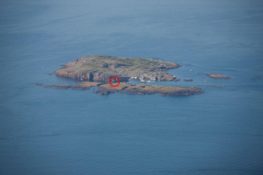 Sundet mellom Søndre Missingen og Ovnskjær. Den røde pila markerer dykkerstedets posisjon.