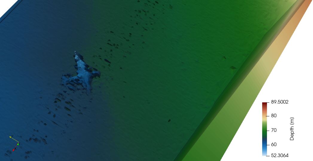 Nærbilde av vraket. Data fra undersøkelse med multistråle-ekkolodd i forbindelse med prosjekt i TMR4120 - Undervannsteknikk ved NTNU.