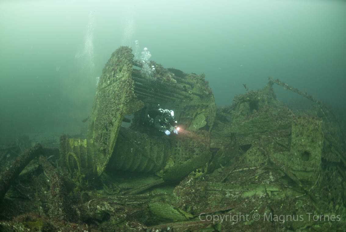 Ene dampkjelen til Herøy. Denne ligger midt i vrakgodset, med resten av dampmotoren rett bak. Denne kjelen er temmelig nedbrutt.