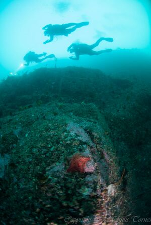 Fin dykkeplass på værutsatt sted. Vær obs på at Ospholmsundet er mye trafikkert av større båter som skal inn til Harøysund og fiskemottaket på Skjæret.