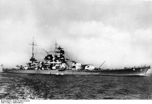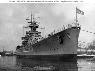 June 1935: Lay down at the Kriegsmarinewerft shipyard in Wilhelmshaven. Slipway 2. 03 October 1936: Launched. 07 January 1939: Commissioned under Captain Otto Ciliax. July-August 1939: Reconstruction at Wilhelmshaven Naval Dockyard. The straight stem is removed and replaced by an Atlantic bow. In addition the hangar is enlarged and equipped with a new catapult. The mainmast in the funnel is removed and placed astern of the hangar. 23 October 1939: Welcomes U-47 (Lieutenant Günther Prien) after its successful attack in Scapa Flow with the crew at quarters in Kiel. 21 November 1939: Departs Wilhelmshaven with her sister-ship Gneisenau under the command of Vice-admiral Wilhelm Marschall. 23 November 1939: At 2000, sinks the 16,697-ton British auxiliary cruiser Rawalpindi (Captain Edward Kennedy). The Scharnhorst is hit by a 152mm projectile from the Rawalpindi but the damage is insignificant. Picks up 27 survivors. 27 November 1939: At midday arrives at Wilhelmshaven. December 1939-February 1940: The MES (Magnetischer Eigenschutz) "magnetic self-protection system" is installed, and a new FuMO 22 radar set is mounted on the foretop platform. 18-19 February 1940: Short sortie in the North Sea. 06 April 1940: Operation Wesserübung. At midnight, leaves Wilhelmshaven with Gneisenau as the cover force of "Group I" for the invasion of Norway. 09 April 1940: Around 0400, some 50 miles off Narvik, Scharnhorst and Gneisenau under the command of Vice-Admiral Günther Lütjens, are engaged by the British battle cruiser Renown. In a brief exchange of fire the Gneisenau receives three 38cm hits and the Renown two of 28cm. 04 June 1940: Operation Juno. At 0700 leaves Kiel with Gneisenau, the heavy cruiser Admiral Hipper and the destroyers Erich Steinbrink, Hans Lody, Hermann Schoemann, and Karl Galster. 08 June 1940: At about 1600, the Scharnhorst sights the British carrier Glorious (Captain D'Oyly-Hughes) escorted by the destroyers Acasta (Comander Charles Glasfurd), and Ardent (Lieutenant Commander J. F. Barker). At 1632 opens fire from 26,000 meters (28,500 yards). Six minutes later at 1638, from 24,000 meters (26,300 yards) the Glorious is hit in the flight deck starting a fire. Gneisenau opens fire at 1642, and a few minutes later the Glorious is hit again in the bridge killing the Captain and most of the personnel there. At 1656, Scharnhorst and Gneisenau cease fire temporarily due to smoke screen launched by the escorting destroyers. Thereafter, the Ardent launches eight torpedoes but obtains no hits and is sunk by the combined fire of both German battleships at 1725. The Glorious comes again under fire, and at 1720 she is hit in the centre engine room. Meanwhile, the Acasta closes on and obtains a torpedo hit on Scharnhorst at about 1730. The torpedo tores a hole of 14x6 meters in the hull, and 2,500 tons of water get on the ship. As a consequence of this torpedo hit the after 28cm turret is put out of action, and 48 men die. Heavily damaged the Glorious capsizes and sinks at 1810. The Acasta finally sinks at 1820. In all more than 1,500 British sailors died. During this action Scharnhorst expends 212 x 28cm and 842 x 15cm shells. 09 June 1940: In the afternoon, Scharnhorst and Gneisenau arrive at Trondheim. June-December 1940: Repair work at Wilhelmshaven. 23 January 1941: Operation Berlino. Departs Kiel with Gneisenau under the command of Admiral Günther Lütjens. 28 January 1941: Scharnhorst and Gneisenau sight the British cruiser Naiad in the Iceland-Faroe strait and turn around. 5 February 1941: Scharnhorst and Gneisenau enter the Atlantic through the Denmark Strait, and refuel from tanker Schlettstadt some 150 miles south of Cape Farewell. 8 February 1941: Sights convoy HX-106 escorted by the battleship Ramillies. Therefore Admiral Lütjens breaks contact. 14 February 1941: Scharnhorst and Gneisenau refuel from tankers Esso Hamburg and Schlettstadt. 22 February 1941: Scharnhorst and Gneisenau sink the British merchantmen Kantara (3,240 tons), Trelawney (4,690 tons), Huff (6,200 tons), tanker Lustrous (6,156 tons), and Harlesden (5,500 tons). 27 February 1941: Scharnhorst and Gneisenau refuel from tankers Ermland and Friedrich Breme and head to the Canary Islands. 06 March 1941: Scharnhorst and Gneisenau meet with U-124 (Lieutenant Wilhelm Schulz). 07 March 1941: Scharnhorst and Gneisenau sight the battleship Malaya that together with other cruisers escorts convoy SL-67 of 58 ships. Lütjens reports the position of the convoy to the U-boats that sink the Hindpool, Lahore, Harmodius, and Nardana, with a total tonnage of 28,500 tons. In the next eight days U-105 and U-106 sink seven more ships and score a torpedo hit in Malaya that heads to New York via Trinidad for repairs. 09 March 1941: Sinks the Greek merchantmen Marathon (6,350 tons). 11-12 March 1941: Scharnhorst and Gneisenau refuel from tankers Ermland and Uckermark. Conference held on board Gneisenau with the Captains of both battleships and the tankers. 16 March 1941: Scharnhorst and Gneisenau capture or sink the British merchantmen Simnia (6,200 tons), San Casimiro (8,050 tons), British Strength (7,140 tons), Athelfoam (6,550 tons), and the Norwegian Bianca (5,700 tons) and Polykarb (6,400 tons), all from a dispersed convoy. Aproximate position 40° 30' North, 43° 45' West. The search continues and later in the day they sink the Norwegian Granli (1,580 tons), the British Demeterton (5,250 tons), Sardinian Prince (3,490 tons), Silverfir (4,350 tons), Royal Crown (4,360 tons), Empire Industry (3,650 tons), and Rio Dorado (4,500 tons), the French Myson (4,560 tons), the Dutch Mangkai (8,290 tons), and the Danish Chilean Reefer (1,830 tons). 22 March 1941: Scharnhorst and Gneisenau enter Brest. March-July 1941: Develops problems with her engines and enter the dry dock for repairs. 24 July 1941: Hit by five bombs while testing the machinery at La Pallice. 3,000 tons of water get on ship and the damage is considerable. August-December 