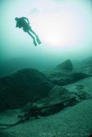 Fin dykkeplass på vær- og strømutsatt sted. På 33 meters dyp på østsiden ligger det en line-dregg.