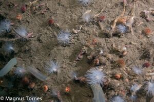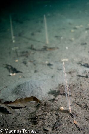 Eremittkrepser på grunna. Sjøstjerner og småfisk lenger ned. Sjøfjærskog av liten piperenser på rundt 17 meters dyp.