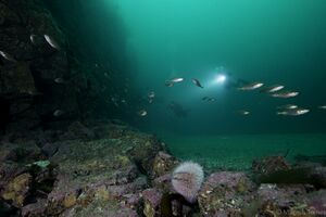 Tareskog og kjøft med sprekker hvor dyrene kan gjemme seg. Også mye leppefisk, lyr, seistimer, taskekrabbe,