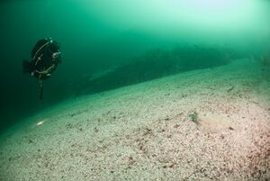 Dersom man går ned ved jerntrappen kan man følge berget nedover. Ved 12 meters dyp åpner det seg en horisontal sprekk som går ned til ca 20 meters dyp. Denne sprekken er ekstra fin på nattdykk. Det er også et lite overheng over sprekken med litt sjønellik. Nedenfor skråner skjellsandbunnen nedover. Lenger østover kommer man til noen fine formasjoner som kan ligne på deler av gamle jettegryter. Fortsetter man videre nordover blir det mer hyller med skjellsand.